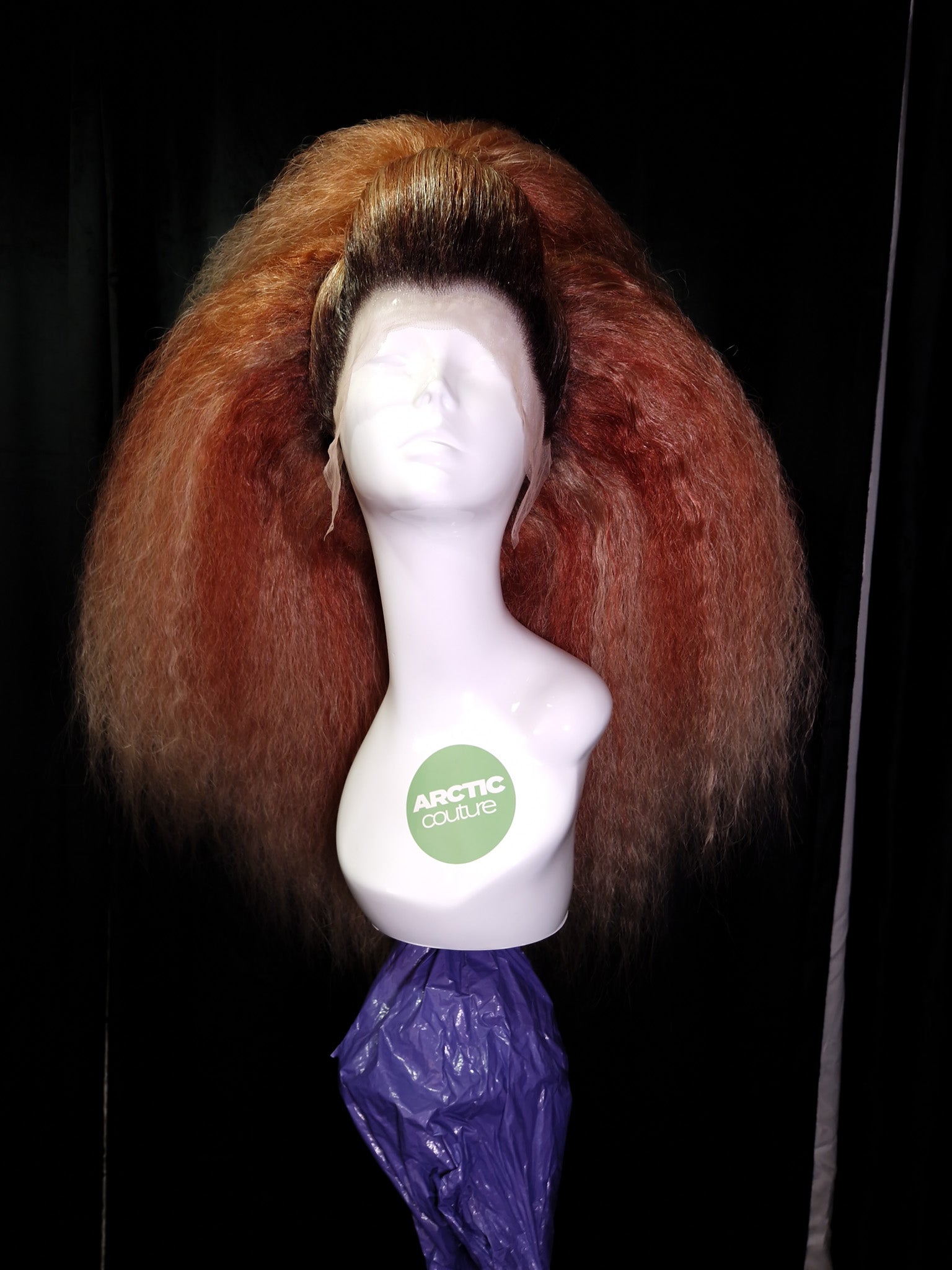 Arctic Couture presents this limited edition Copper Balayage 80s CrimpedHalf-up Drag Wig, utilising copper and blonde tones, and she could be yours! She is extremely fluffy and good for the divas who love to move the hair without it getting into their faces.